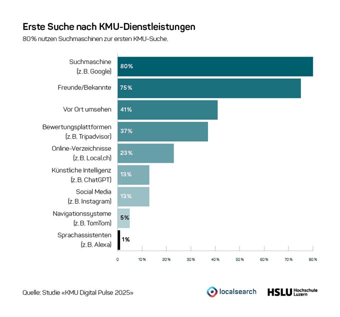 Wenn die Schweizerinnen und Schweizer ein KMU suchen und noch keinen Anbieter kennen, nutzen acht von zehn Personen (80 %) zuerst eine Suchmaschine wie Google. Lediglich 13 % der Befragten verwenden Social Media als erste Anlaufstelle bei der Suche nach KMU-Dienstleistungen (siehe Abbildung 1).