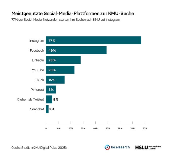 Die Studie «KMU Digital Pulse 2025» von localsearch und der Hochschule Luzern (HSLU) zeigt weitere Ergebnisse, und zwar in Bezug auf die Nutzung von Social Media. So führt in der Gesamtbevölkerung Instagram das Ranking der beliebtesten Plattformen zur KMU-Suche klar an, gefolgt von Facebook und LinkedIn. Bei den unter 30-Jährigen verdrängt TikTok derweil LinkedIn vom dritten Platz.
