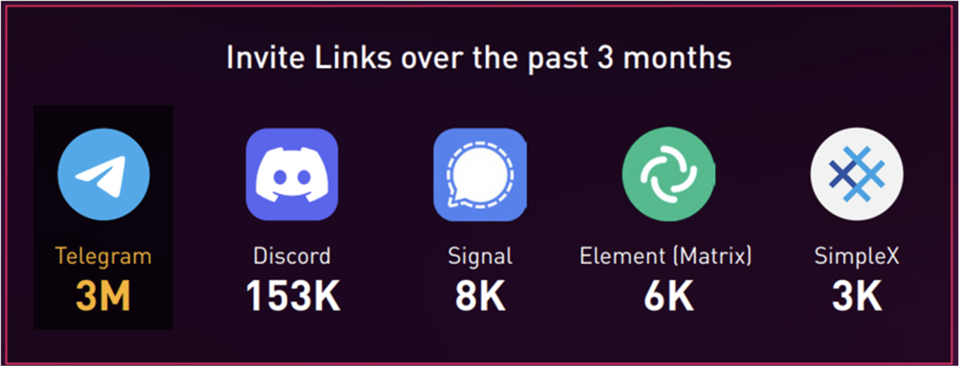 Despite brief experiments with alternative channels, Telegram remains the platform of choice. One prominent example is the Akula group, which temporarily switched to SimpleX at the beginning of 2025 but returned because the community did not follow suit to the extent required. Individual players use alternative apps for 1:1 communication, but Telegram remains the central location for outreach, recruitment and marketplace structures, i.e. trading in stolen information.
