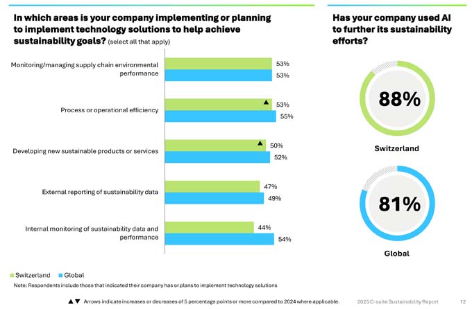 Technology has become the top corporate priority in Switzerland (56%), closely followed by sustainability (47%). This shows that the two topics are inextricably linked. 88 percent of Swiss companies surveyed already use AI as a tool for their sustainability efforts – more than the global average of 81 percent. They have recognized that without technology, there can be no measurable sustainability transformation. Technology is primarily used in supply chain management (53%), to increase operational efficiency (53%), to develop sustainable products (50%), and to report on sustainability impact (47%).