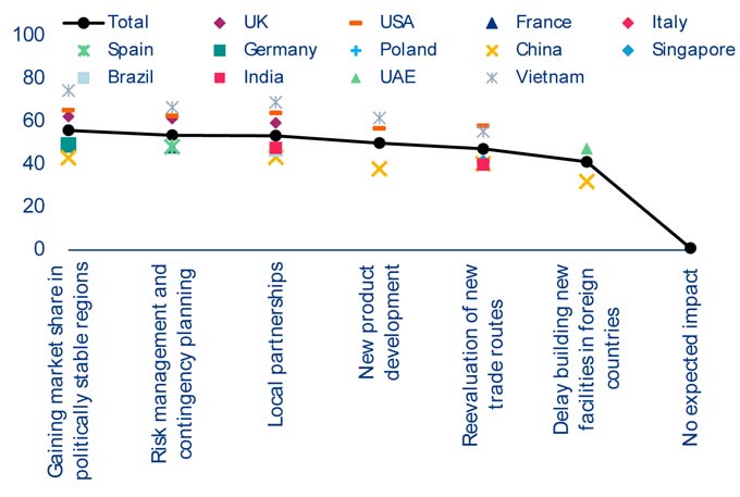 Le aziende si concentrano anche su una maggiore sicurezza delle loro catene di approvvigionamento: il 60% sta creando scorte, il 55% sta sviluppando nuovi fornitori e il 52% si sta espandendo in nuovi mercati. Nel confronto internazionale, gli esportatori tedeschi tendono ad agire con cautela; secondo lo studio di Allianz Trade, l'impulso a dirottare le merci verso Paesi terzi è più marcato a livello mondiale che in Germania.